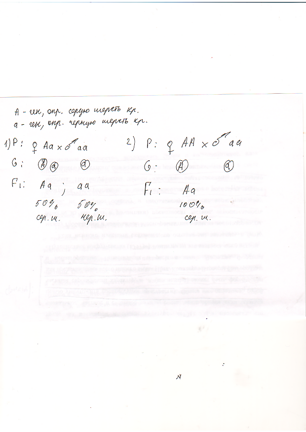 6. Были взяты шесть серых кроликов - самок и скрещены с рецессивным гомозиготным черным самцом. В пяти случаях все потомство состояло из серых кроликов. В одном случае из девяти кроликов в потомстве оказалось пять серых и четыре черных. Составьте схемы скрещивания для каждого случая. Определите генотипы родителей и потомков во всех случаях скрещивания.