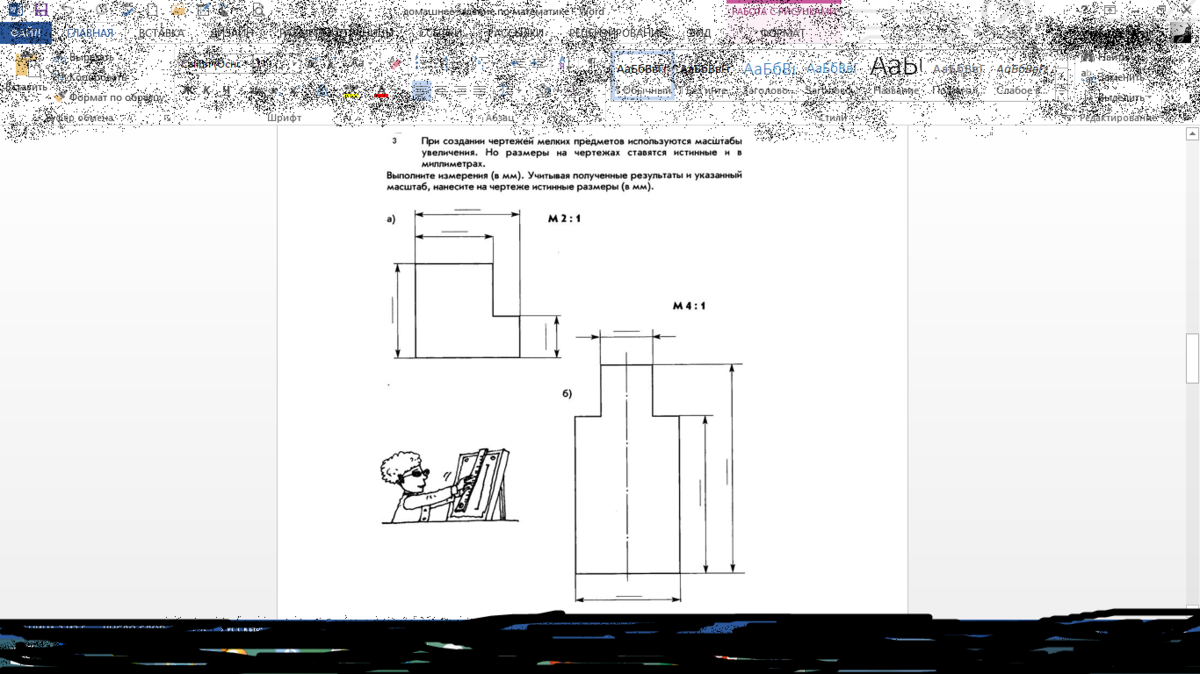 Выполните измерения (в мм).Учитывая полученные результаты и указанный масштаб,нанесите на чертеже истинные размеры(в мм).