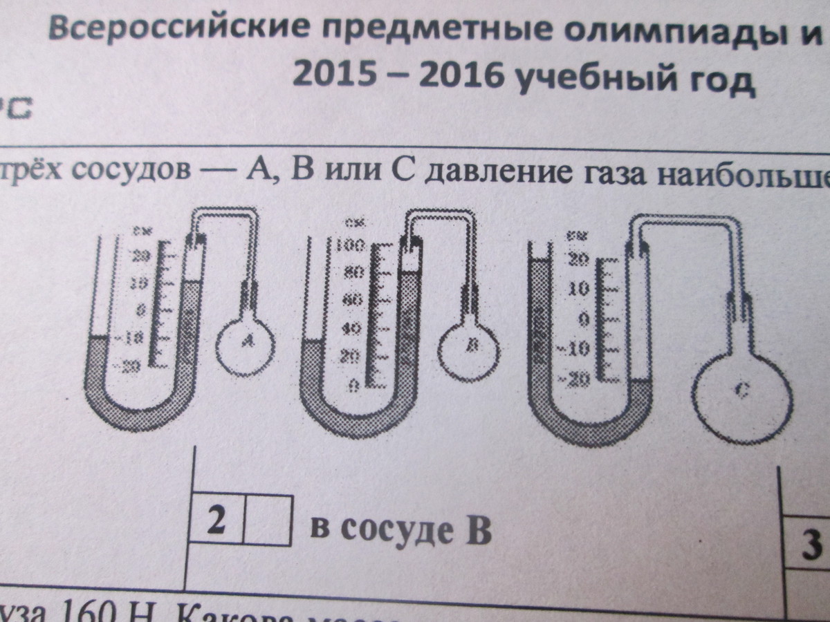 В крайнем справа (С), столбик жидкости в правой половине трубки ниже всех, это значит давление в колбе наибольшее, в остальных давление меньше атмосферного (столбики жидкости наоборот).