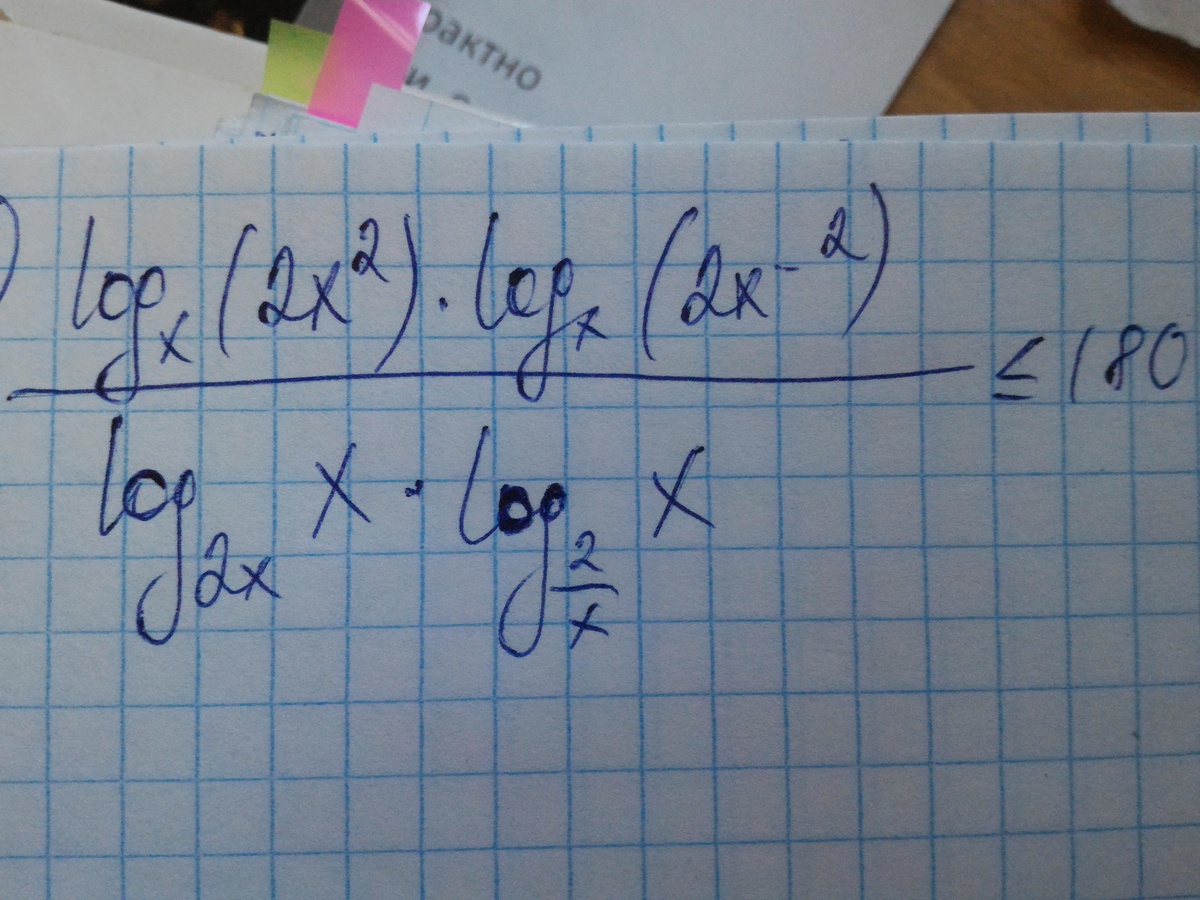 frac{log_{x}(2x^2)cdot log_{x}(2x^{-2})}{log_{2x}xcdot log_{frac{2}{x}}x}  leq 180\\ODZ:; x textgreater  0,xne 1,2xne 1,frac{2}{x}ne 1,; log_{2x}xcdot log_{frac{2}{x}}xne 0\\ frac{frac{lg(2x^2)}{lgx}cdot frac{lg(2x^{-2})}{lgx}}{frac{lgx}{lg(2x)}cdot frac{lgx}{lg(frac{2}{x})}}  leq 180; ,; ;  frac{(lg2+2lgx)(lg2-2lgx)(lg2+lgx)(lg2-lgx)}{lg^4x}  leq 180\\\tak; kak; ; lg^4x geq 0,; to; \\(lg2+2lgx)(lg2-2lgx)(lg2+lgx)(lg2-lgx) leq 180lg^4x\\Zamena:; ; lg2=a; ,; lgx=t