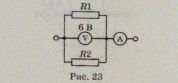 Рассчитайте общее сопротивление цепи и определите показания амперметра (рис. 23), если R1 = R2 = 12Ом.