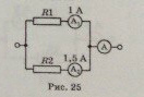 Определите показания амперметра А и напряжение на концах каждого проводника (рис. 25), если R1 = 15 Ом, R2= 10 Ом.