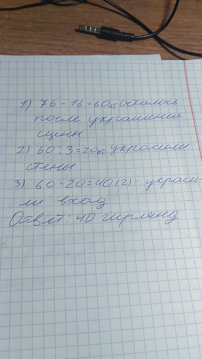 для украшения зала мальчики сделали 76 гирлянд из цветных фонариков на украшение сцены пошло 16 гирлянд третьей частью оствшихся гирлянд украсили стены а остальными вход в школу сколько гирлянд украшали вход в школу
