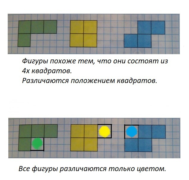 Начерти в тетради такие фигуры: ... Сравни все фигуры между собой: чем они похожи, чем различаются? Дорисуй в каждой фигуре по одному квадрату так, чтобы все фигуры отличались друг от друга только цветом.