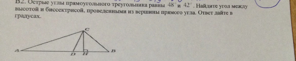Рассмотрим ΔАВС: ∠С=90, ∠А=42,∠В=48.