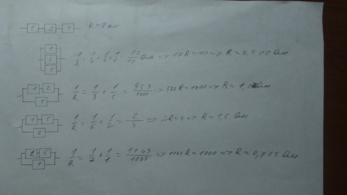 Составьте все возможные схемы подключения трех резисторов R1=1 ОМ , R2 =2 ОМ, R3=5 ОМ.