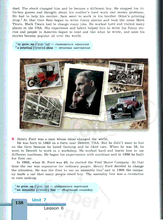 1. Henry Ford was born and grew up in 1863 on a farm near Detroit, USA, He worked hard in a workshop. His ambition was to make cars. Henry Ford was the person who decided to make cars cheaper so that many people could buy them. He used the assemby-line to make cheaper cars and it helped him to achieve a lot and made him famous.