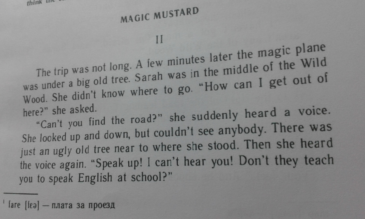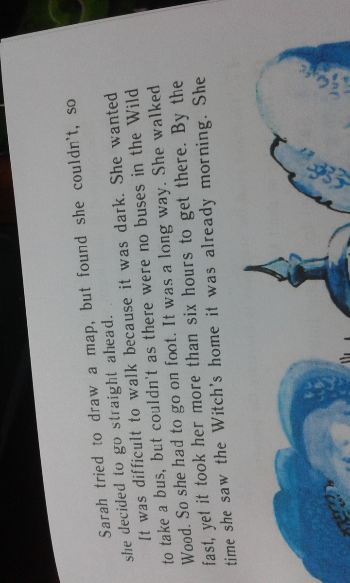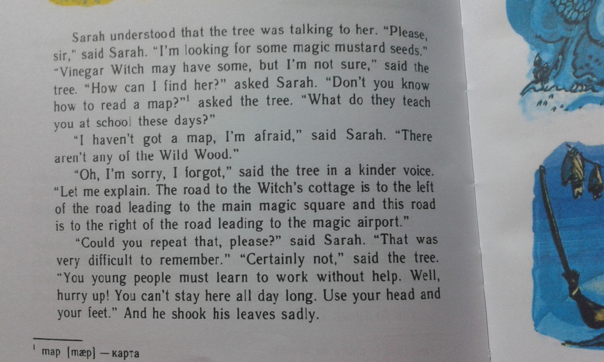 Сара поняла, что с ней говорило дерево. "Пожалуйста, сэр",-сказала Сара. "Я ищу несколько волшебных семян горчицы". "У Уксусной(/лол, не я придумала, реально так переводится/) ведьмы, может быть, найдутся,"-ответило дерево. "Как я могу найти ее?"-спросила Сара. "Не умеешь читать карты?"-спросило дерево. "Чему они сейчас учат вас в школе?"