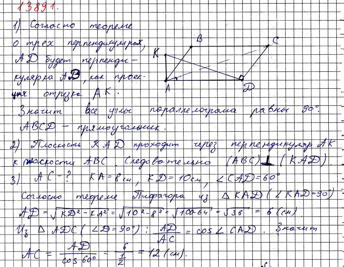 прямая КА перпендикулярна плоскости через параллелограмма АВСD.Известно что KD перпендикулярна СD.а)Докажите,что ABCD-прямоугольник.б)Зная,что КА-8 см,КD-10см,угол САD-60градус,найдите АС