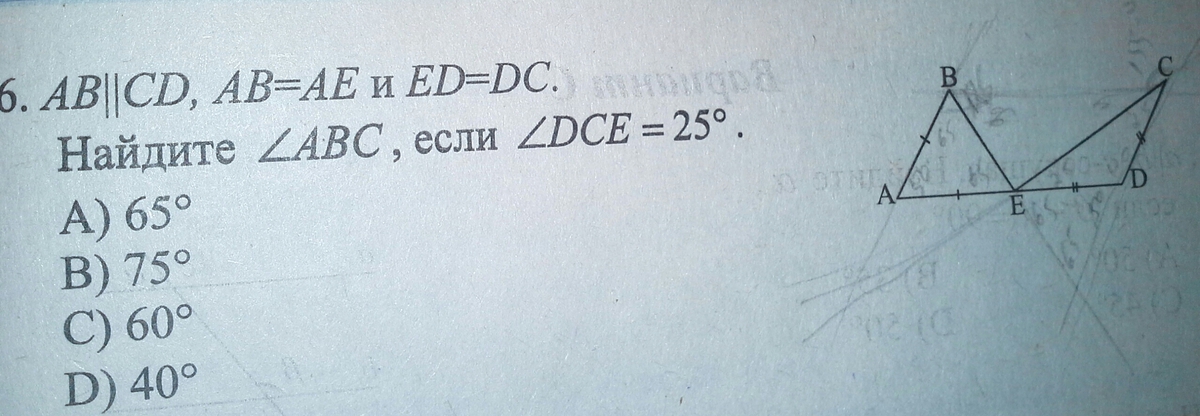 Треугольник CDE равнобедренн. ( сумма углов =180,углы при основании равны) угол D =130 (180-(25+25)) угол D = углу В ( AB паралельнна CD) -накрестлежащие. 130:2=65 Вроде так о-о"