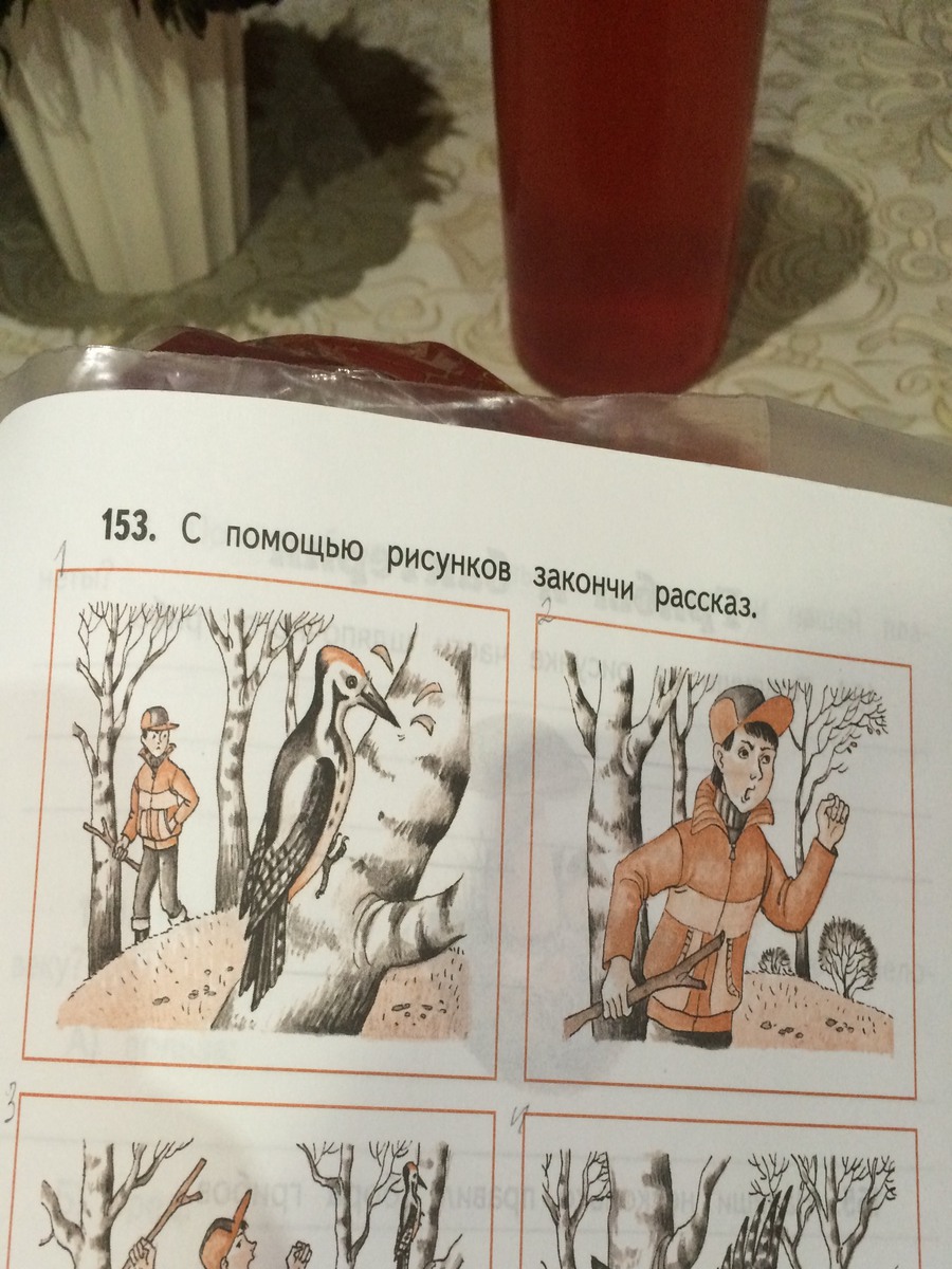 С помощью рисунков закончии рассказ. Пришел Петя в березовую рощу.Видит: на березе сидит дятел и долбит её изо всех сил. Только щепки летят.