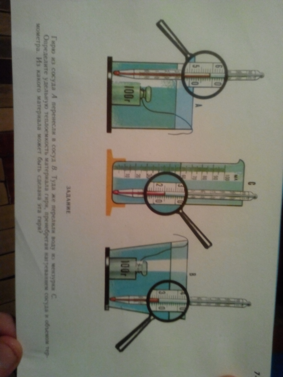 Гирю из сосуда А перенесли в сосуд В. Туда же перелили воду из мензурки С. Определите удельную теплоёмкость материала гири, пренебрегая нагреванием сосуда и объёмом термометра. Из какого материала может быть сделана эта гиря?