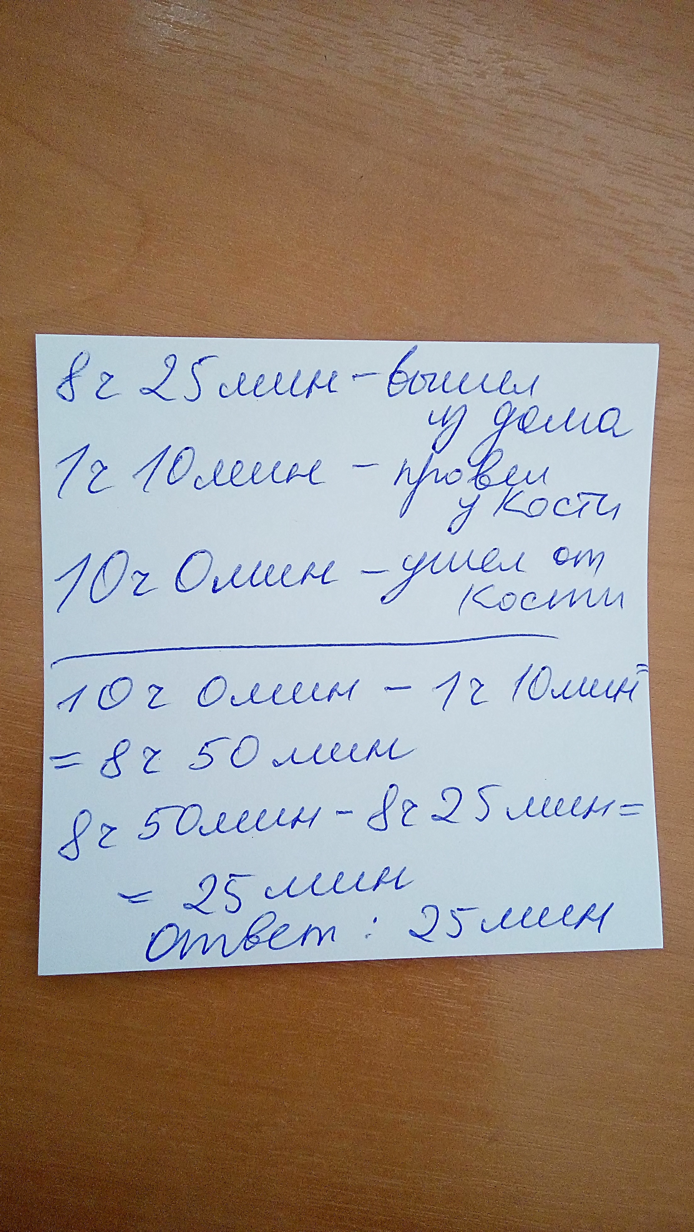 Миша пошел в гости к Косте и пробыл у него 1.ч10мин сколько времени потратил мишка на дорогу если из дома он вышел в 8.ч25мин. а от кости в 10ч ровно