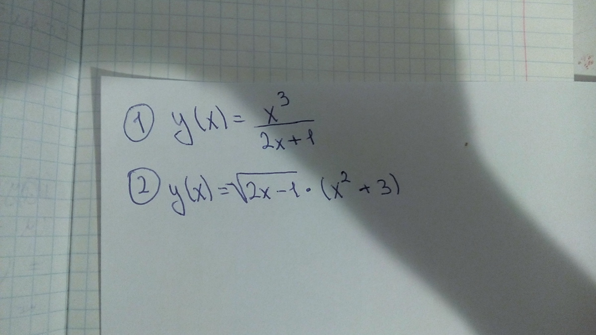 1. y'(x) = (u'*v-v'*u)/v^2 = ((3x^2)*(2x+1)-2*x^3)/(2x+1)^2=(6x^3+3x^2-2x^3)/(2x+1)^2= (4x^3+3x^2)/(2x+1)^2= (4x^3+2x^2+x^2)/(2x+1)^2= 2x^2*(1/2x+1) + (x/(2x+1))^2