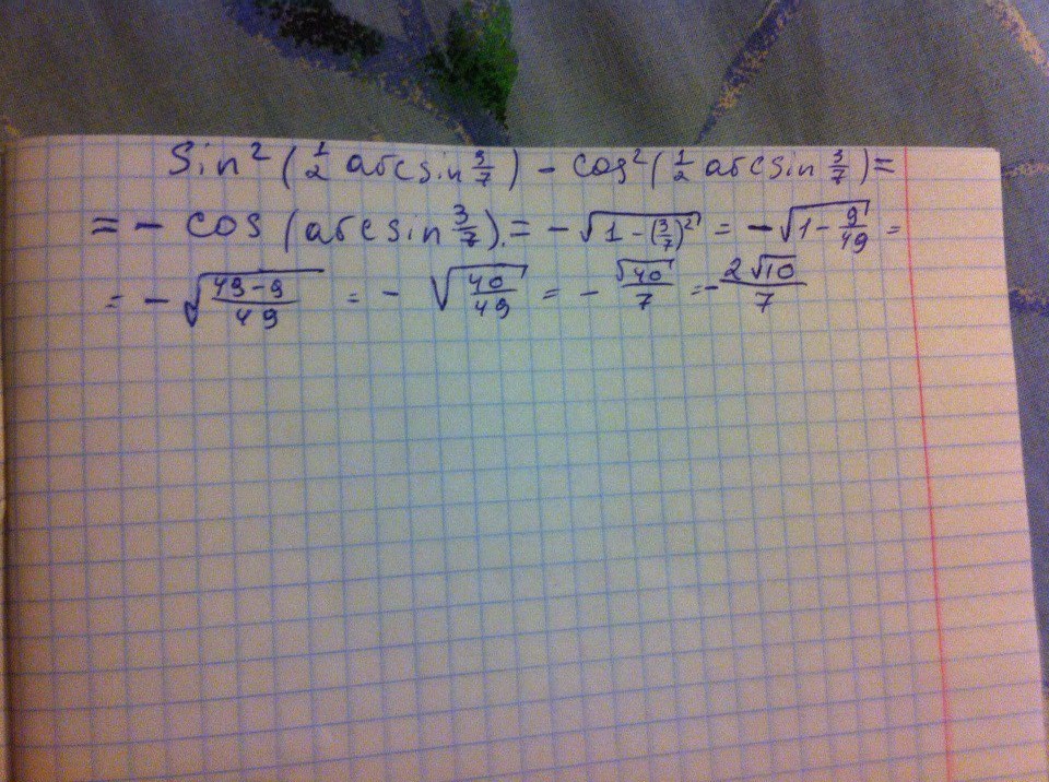 cos(arcsin3/7). вообще, дальше я хз как, но инет говорит, что cos(arcsinx)=sqrt(1-x^2), т.е. получим
