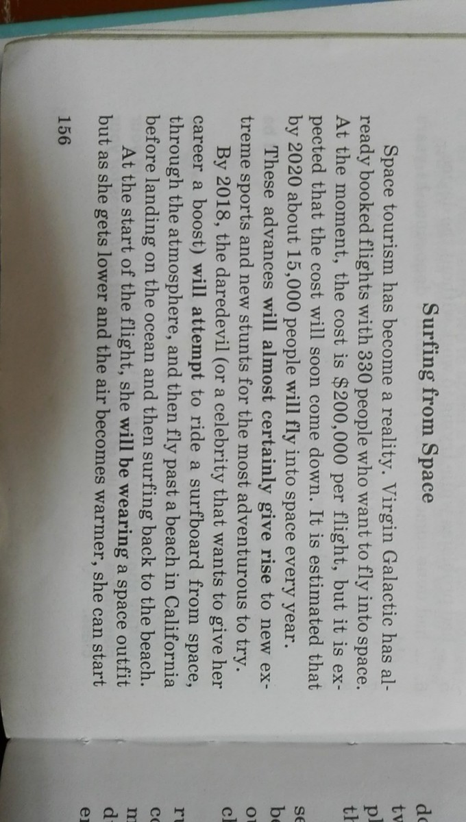Космический туризм станет реальностью. Virgin Galactic уже забронировали авиабилеты на рейс 330 человек, которые хотят летать в космос. На данный момент, стоимость S200.000 в полете, но ожидается, что стоимость скоро сойдет. Предполагается, что к 2020 году около 15.000 человек полетит в космос с каждым годом.