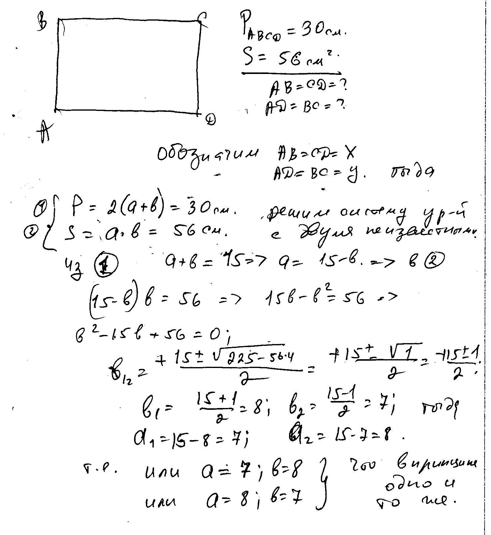 ПЕРИМЕТР ПРЯМОУГОЛЬНИКА РАВЕН 30 СМ. НАЙДИТЕ ЕГО СТОРОНЫ ,ЕСЛИ ИЗВЕСТНО ЧТО ЕГО ПЛОЩАДЬ РАВНА 56СМ ²