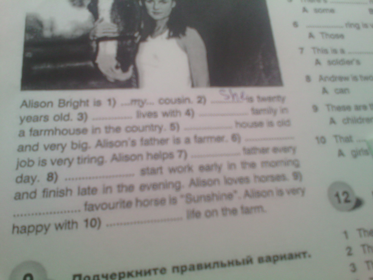 Alison Bright is my cousin. She is twenty years old. She lives with her family in a farmhouse in the country. Her house is old and very big. Alison's father is a farmer. His job is very tiring. Alison heps her father every day. They start work early in the morning and finish lately in the evening. Alison loves horses. Her favourite horse is "Sunshino (или как там...)". Alison is very happy with her life on the farm.