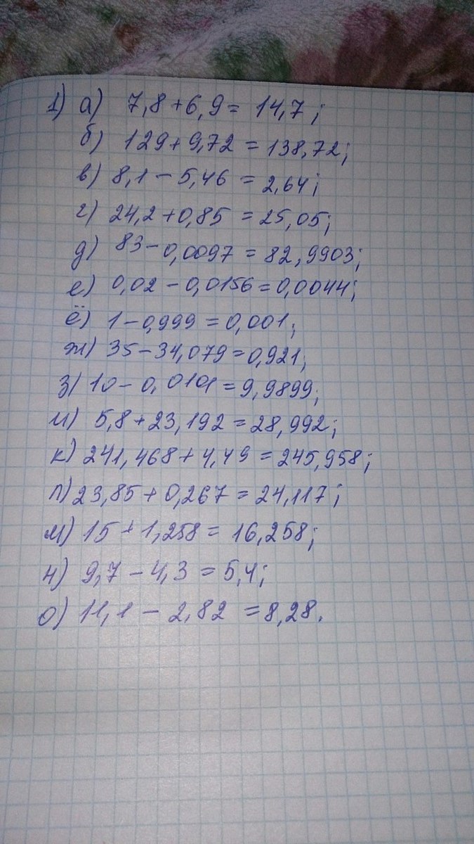 а) 7,8+6,9; б) 129+9,72; в) 8,1 – 5,46; г) 24,2+0,85; д) 83 – 0,0097; е) 0,02 – 0,0156; ё) 1 – 0,999; ж) 35 – 34, 079; з) 10 – 0,0101; и) 5,8 + 23,192;