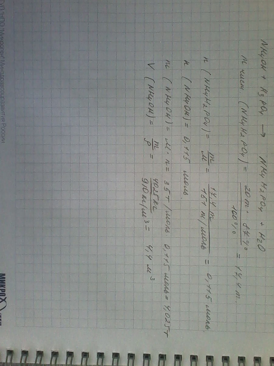 8-9. Рассчитайте, какой объем 25-процентного раствора аммиака (плотность 910 кг/м3) потребуется для получения дигидроортофосфа-та аммония массой 20 т, если выход его составляет 87 % от теоретического.