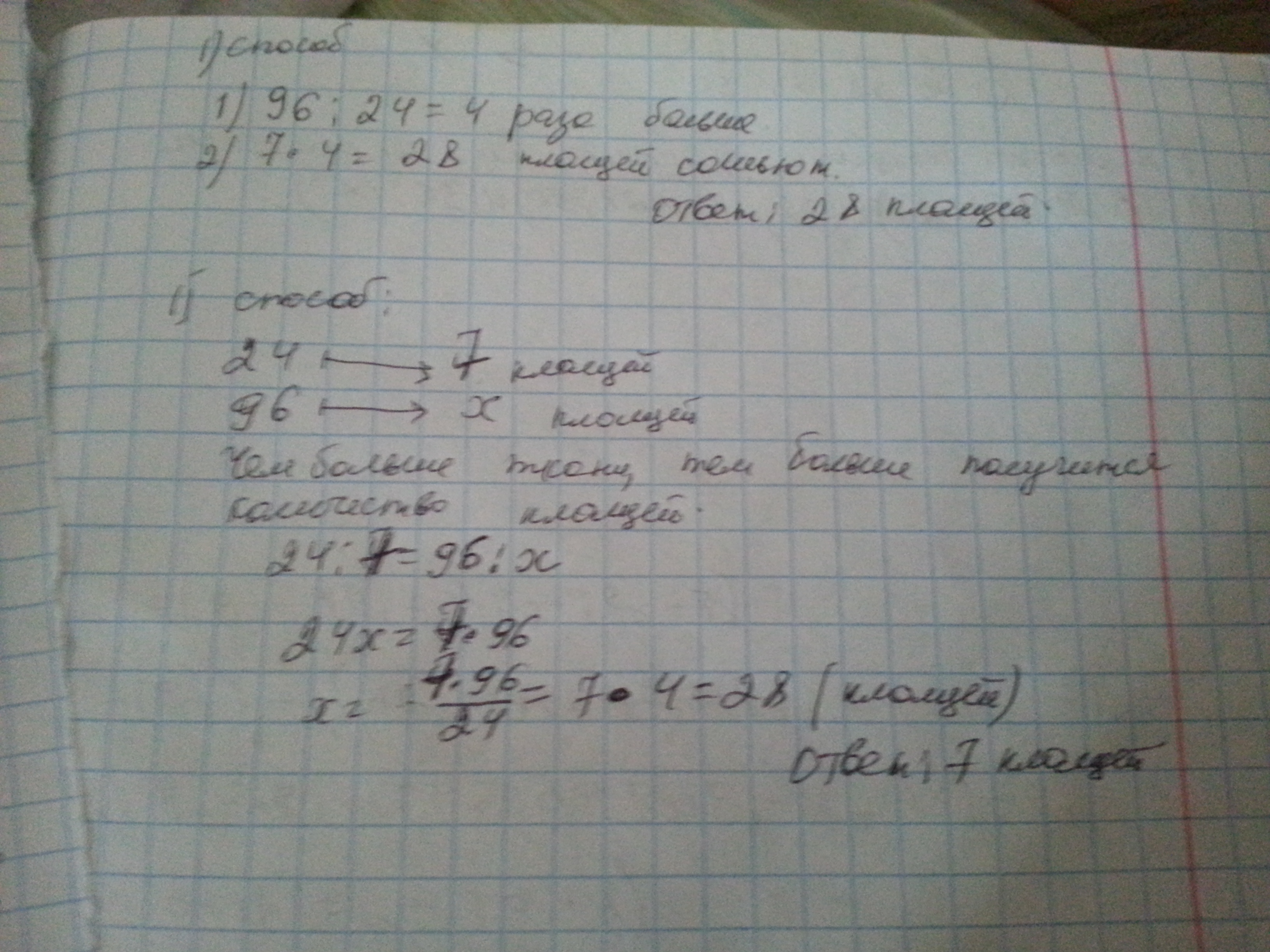 Из 24 локтей ткани сшили 7 плащей для гладиаторов. Сколько таких же плащей сошьют из 96 локтей ткани?