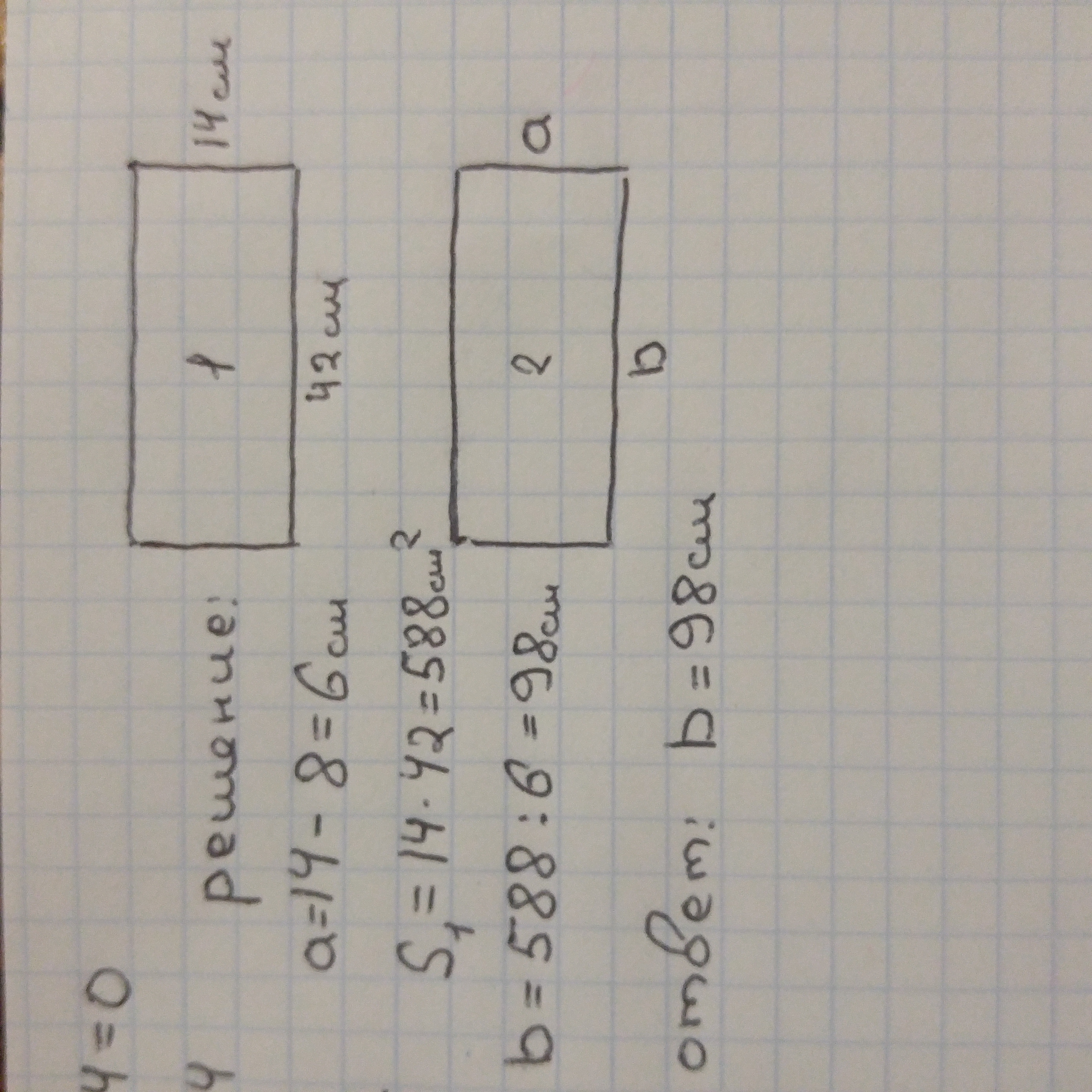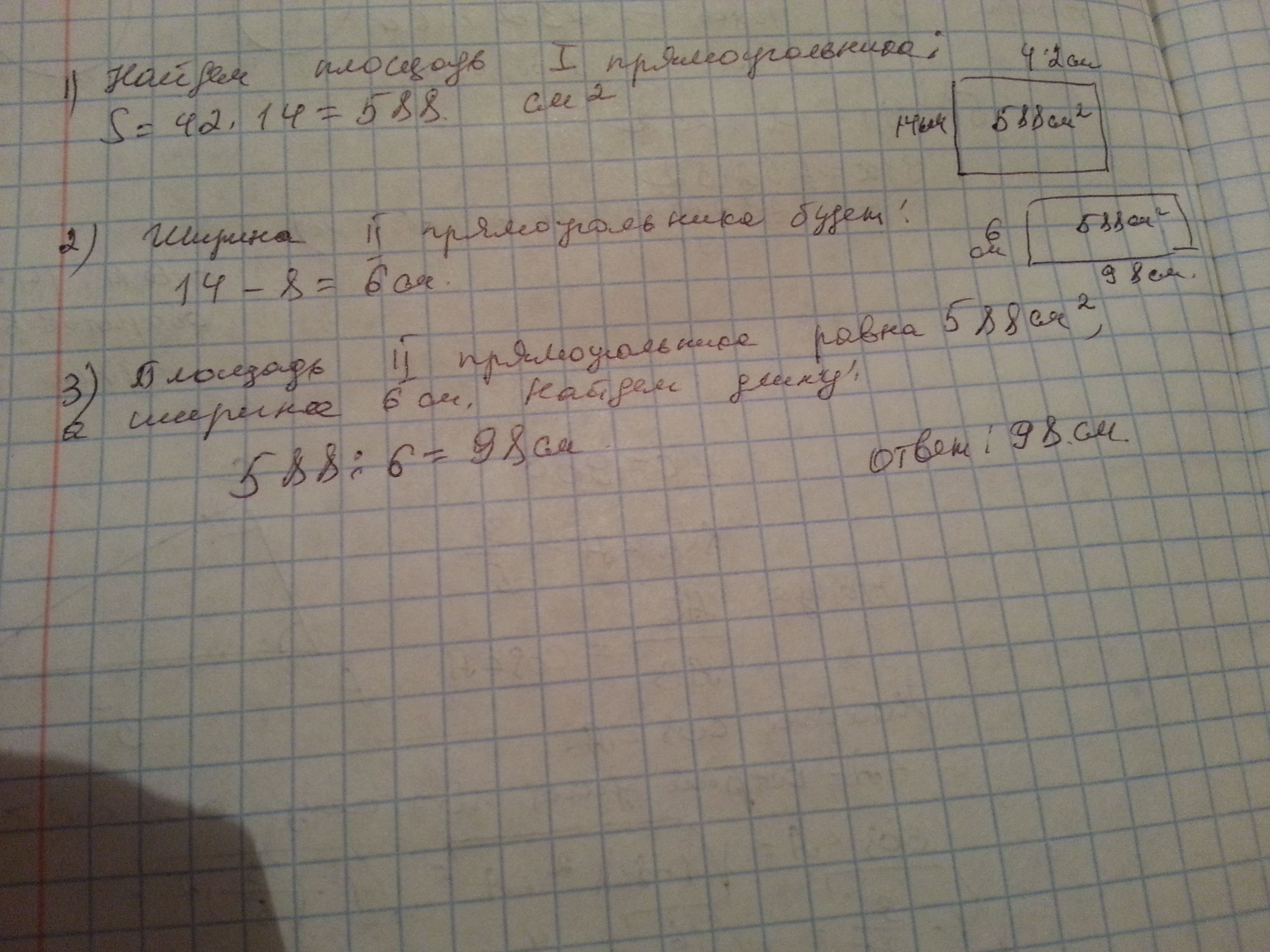 Есть два прямоугольника одинаковой площади. Длина первого 42см, ширина 14 см. Ширина второго на 8 см меньше ширины первого. Найди длину второго прямоугольника.