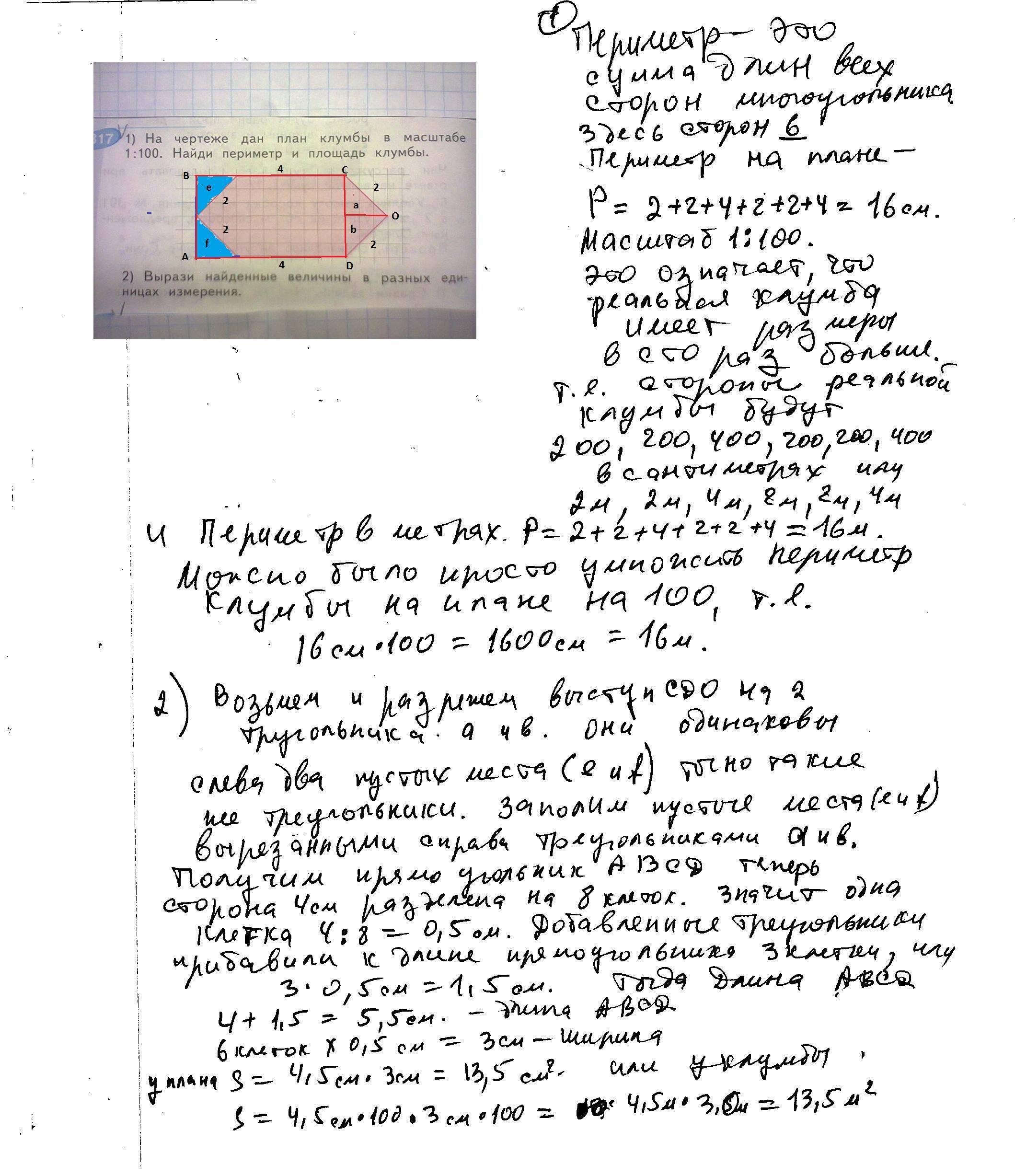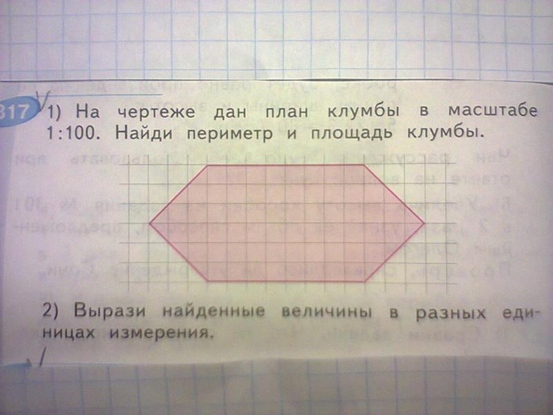 На чертеже дан план клумбы в масштабе 1:100. Найди периметр и площадь клумбы.