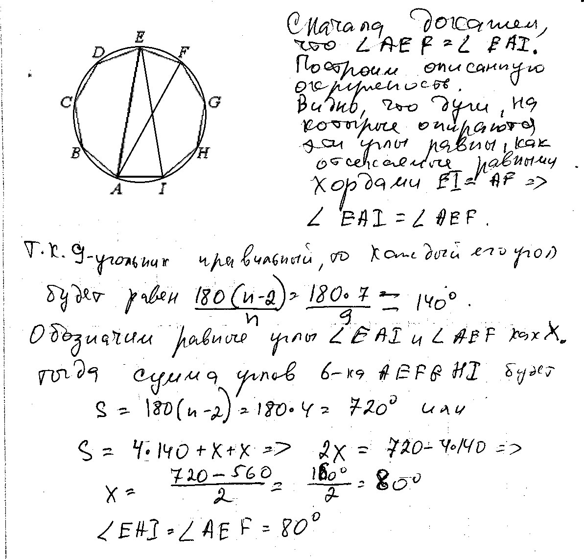 ABCDEFGHI – правильный девятиугольник. Найдите угол EAI. Ответ дайте в градусах.