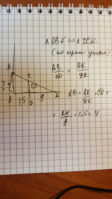 Человек ростом 1.5 стоит на расстоянии 15 шагов от столба , на котором весит фонарь. тень человека равна 9 шагам на какой высоте расположен фонарь