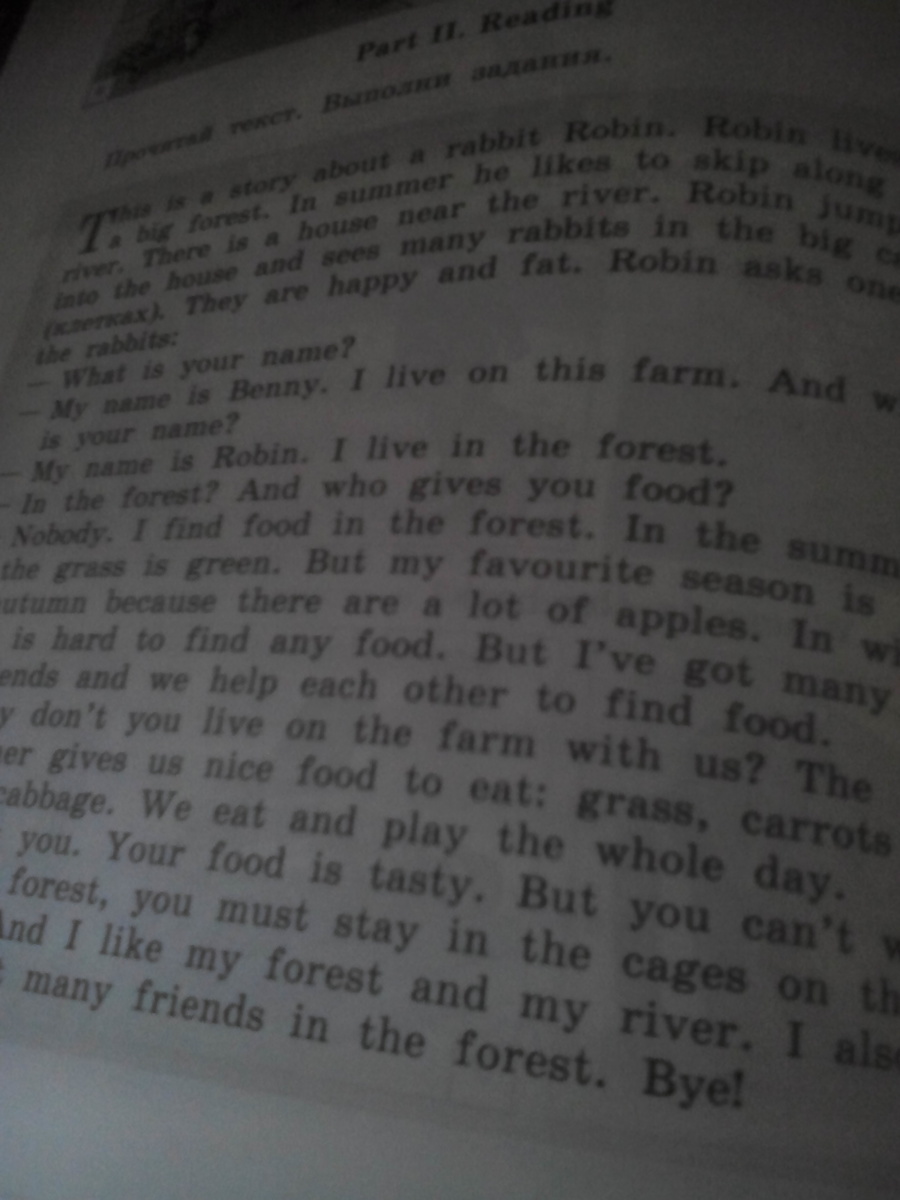 Эта история о кролике Робине. Робин живет в большом лесу. Летом ему нравится спускаться вдоль реки. Его дом находится около реки. Робин запрыгивает в дом и видит много кроликов в больших клетках. Они счастливые и откормленные. Робин спрашивает у одного из кроликов: