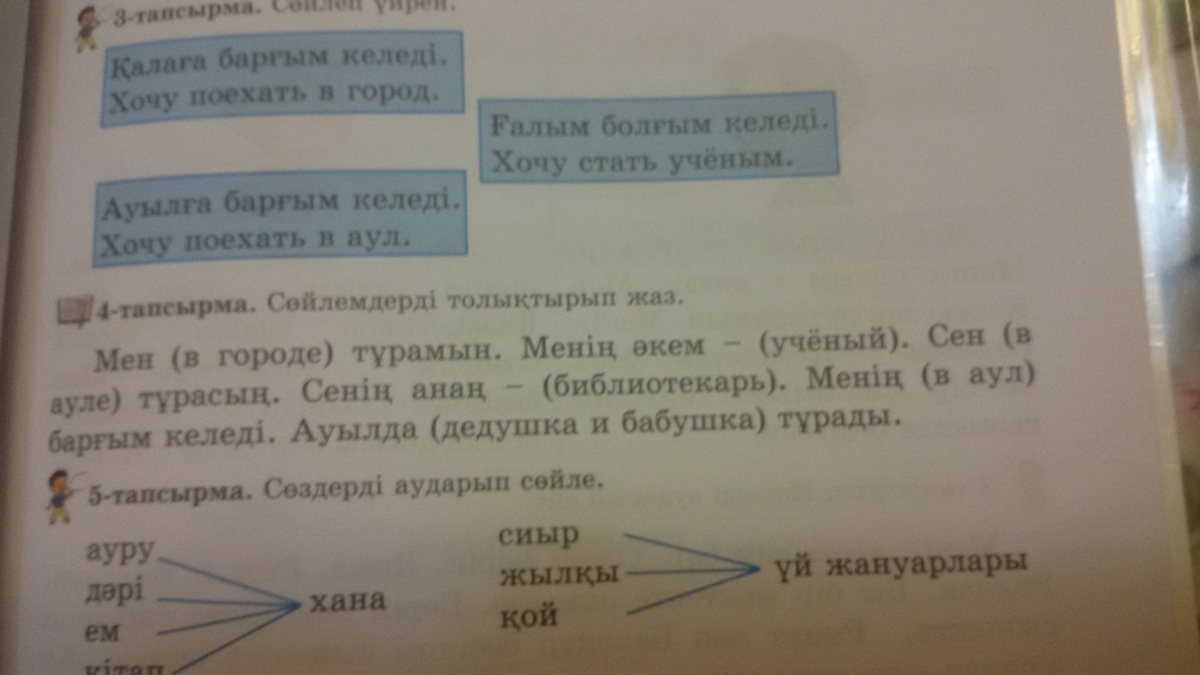 Мен қалада тұрамын. Менің әкем - ғалым. Сен ауылда тұрасың. Сенің анаң -кітапханашы. Менің ауылға барғым келеді. Ауылда атам және әжем тұрады.