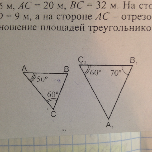 В треугольнике A1B1C1 угол A1=180-70-60=50 градусов