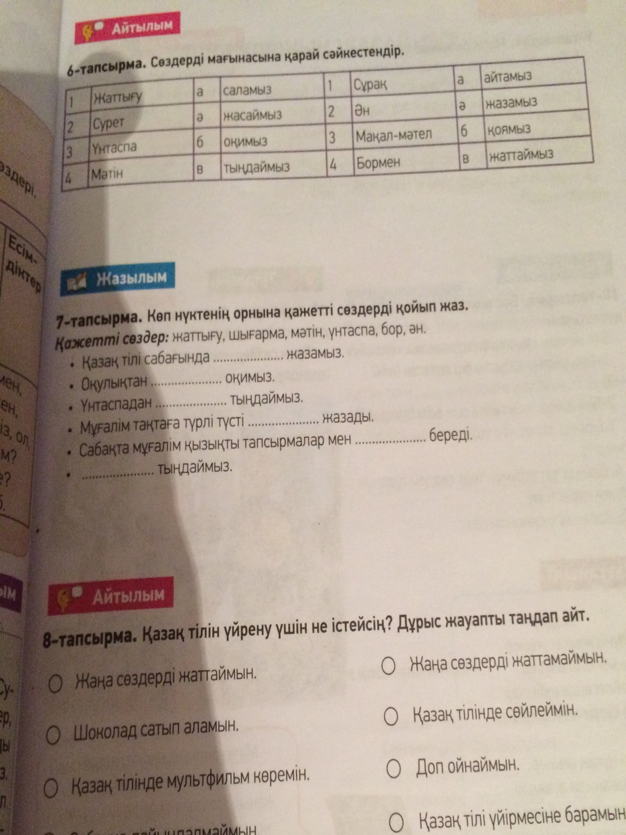 1 жаттығу 2 мәтін 3 ән 4 бор 5 шығарма 6 үнтаспа