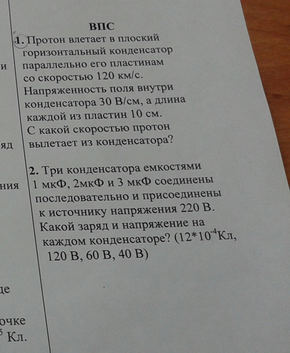 Т.о. скорость протона складывается из двух составляющих - одна из составляющих равна 24*10^4 (перпендикулярная пластинам), другая 120км/с = 12*10^4.