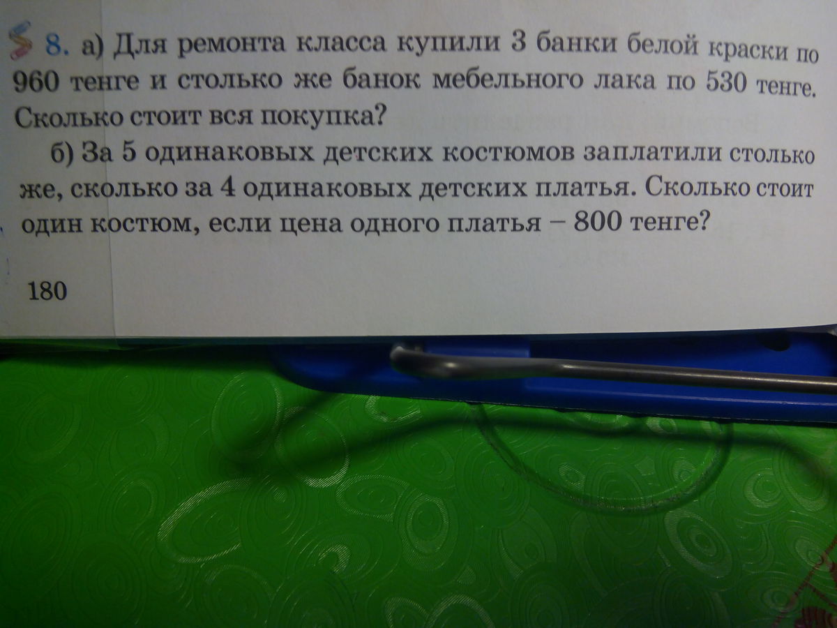 Б)1) 4•800=3200(тенге)-стоят 4 платья. 2)3200:5=640(тенге)-стоит один костюм.