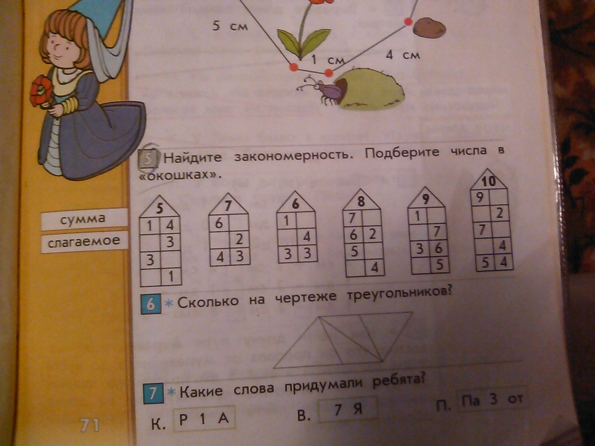 (цифра которая написана в крыше домика-это сумма цифр в окошках.т.е. в 1 домике цифра 5 в крыше.значит ы окошках должны быть такие цифры,что при сложении их должна быть 5 . так же и в других домиках.Разбирайся☺)