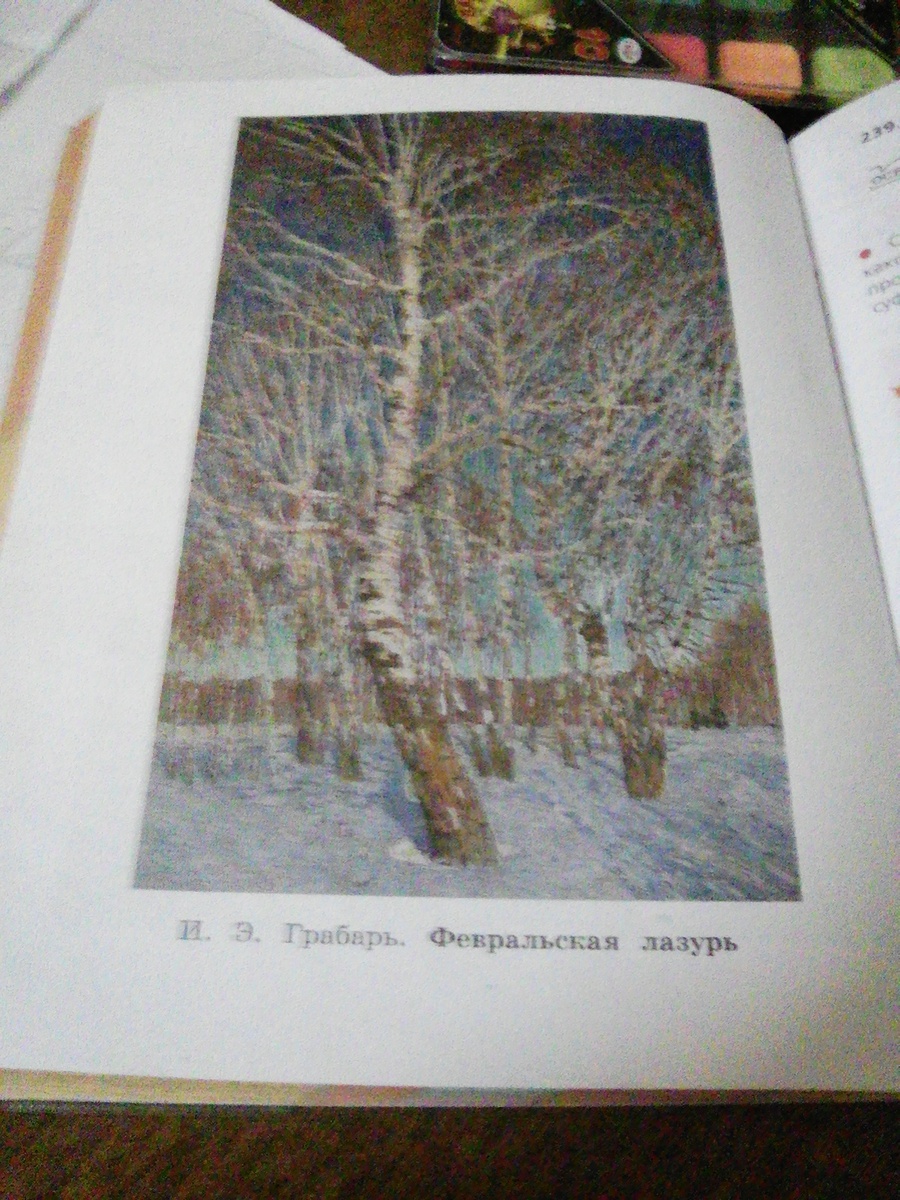 Изображение зимнего пейзажа на картине русского художника Игоря Грабаря передает настроение зимнего леса, уже готовящегося к приходу весны. Последние зимние дни в лесу, февральская лазурь, окутывающая редкие березы.Картина изображена таким образом, словно художник рисовал её лежа, смотря на образец снизу. И этот прием придает картине удивительный эффект.Березы, снег, небо, казалось бы, сколько белого цвета нужно использовать, чтобы изобразить эту картину. Но художник не перенасыщает картину светлыми тонами. Не совершенная чистота снега, проблески проталин — все говорит о скором приближении весны.Весенних же цветов использовано много — целая палитра пастельных и ярких тонов. Немало оттенков голубого цвета, цвета ультрамарина, в который окрашено небо над березовым лесом. Сочетания этих цветов сливаются в невероятную гармонию- музыку весны, и легкую грусть расставания с зимой.Форма березы, изображенная на картине «февральская лазурь» заслуживает отдельного внимания. На фоне лазурного неба ветки березы имеют удивительный, таинственный и притягательный вид. Эта, картина, безусловно, поднимает настроение тем, кто её рассматривает. Именно такого эффекта добивался художник. Радость прихода весны, улыбка проснувшихся деревьев, ясное голубое небо нежно легли на холст «поэта русской зимы» выдающегося русского художника Игоря Грабаря.На центральной березе еще виднеется кружевной иней, он сверкает блестками, словно на березу накинуты бусы. Настоящая красавица — русская береза. А позади величественной «солистки» создают ансамбль не менее прекрасные березки, которые также радуются скорому приходу весны и готовы встретить её своей праздничной лесной песней.Даже название картины «Февральская лазурь» уже дает понять, что эта картина раскроет удивительный поэтический мирок русской поздней зимы, представленный в изображении небольшого кусочка родной земли.http://opisanie-kartin.com/opisanie-kartiny-igorya-grabarya-fevralskaya-lazur/