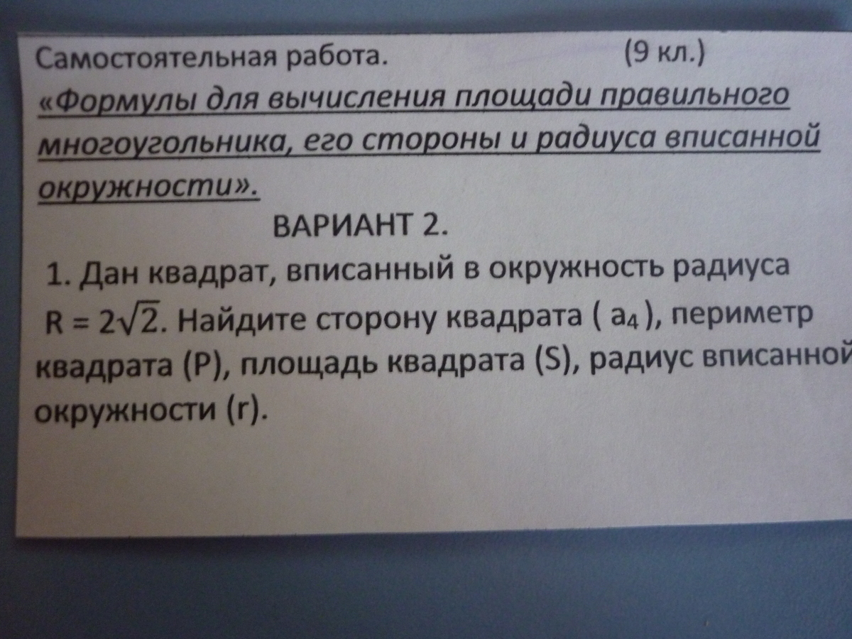 Дан квадрат,вписанный в окружность радиуса R=2корень из 2.Найдите сторону квадрата (а4),периметр квадрата (P),площадь квадрата (S),радиус вписанной окружности(r).(ПОЖАЛУЙСИА,ПОЛНОЕ РЕШЕНИЕ!)