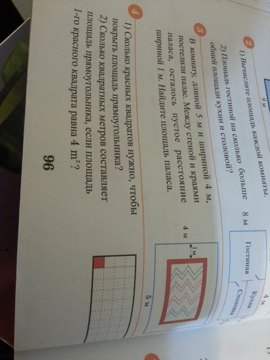 В комнату, длиной 5м и шириной 4м,постелили палас. Между стеной и краями паласа, осталось пустое расстояние шириной 1м .Найдите площадь паласа.