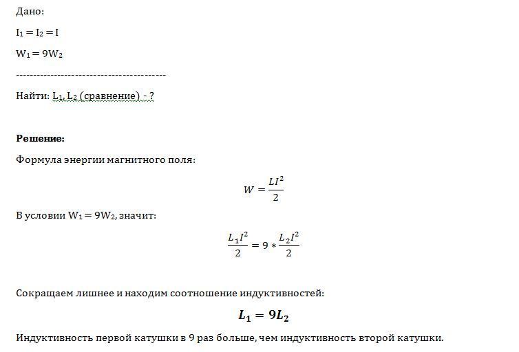 Сравните индуктивности L1 и L2 двух катушек,если при одинаковой силе тока энергия магнитного поля,создаваемого током в первой катушке,в 9 раз больше,чем энергия магнитного поля,создаваемого током во второй катушке.