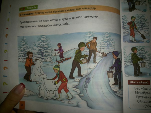 Мадина шаңғымен сырғанады.Алима қардан қонжық, ал Мерей үйшік жасады. Аманжол, Ержан және Санжар қарға су құйып сырғанақ жасап жатыр.