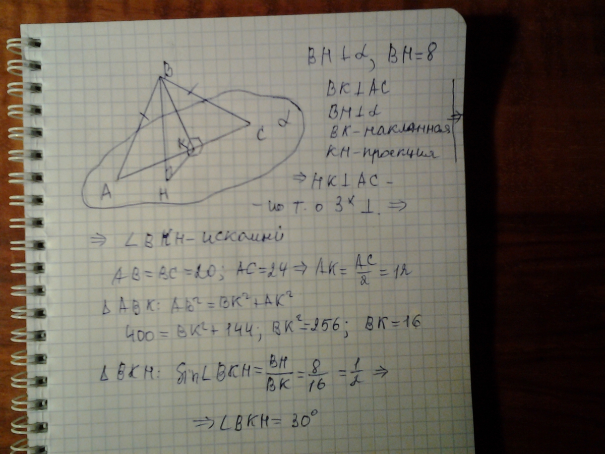 Найдите угол между плоскостью α и плоскостью треугольника, если a= 8см, b=24 см, c= 20 см.