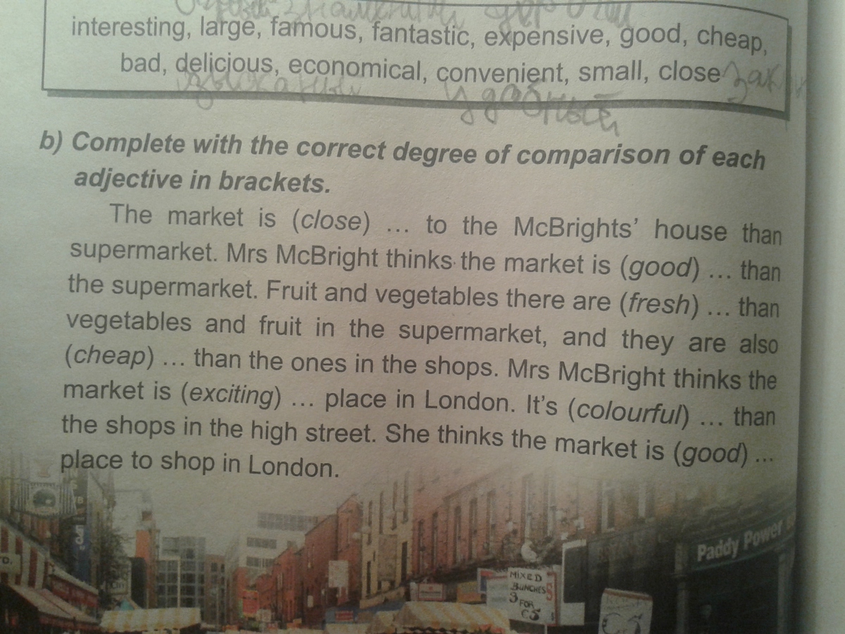 Рынок (близко) ... к дому Макбрайтс, чем супермаркет. Г-жа Макбрайтс думает, что рынок (хороший) ... , чем супермаркет. Фрукты и овощи там (свежый) ... , чем овощи и фрукты в супермаркете, и также они (дешевый) ... , чем в магазинах. Г-жа Макбрайтс думает, что рынок (взволнованный) ... место в Лондоне. Он (разноцветный, пестрый, яркий) ... , чем магазины на главной улице. Она думает, что рынок (хороший) ... место, чтобы делать покупки в Лондоне.