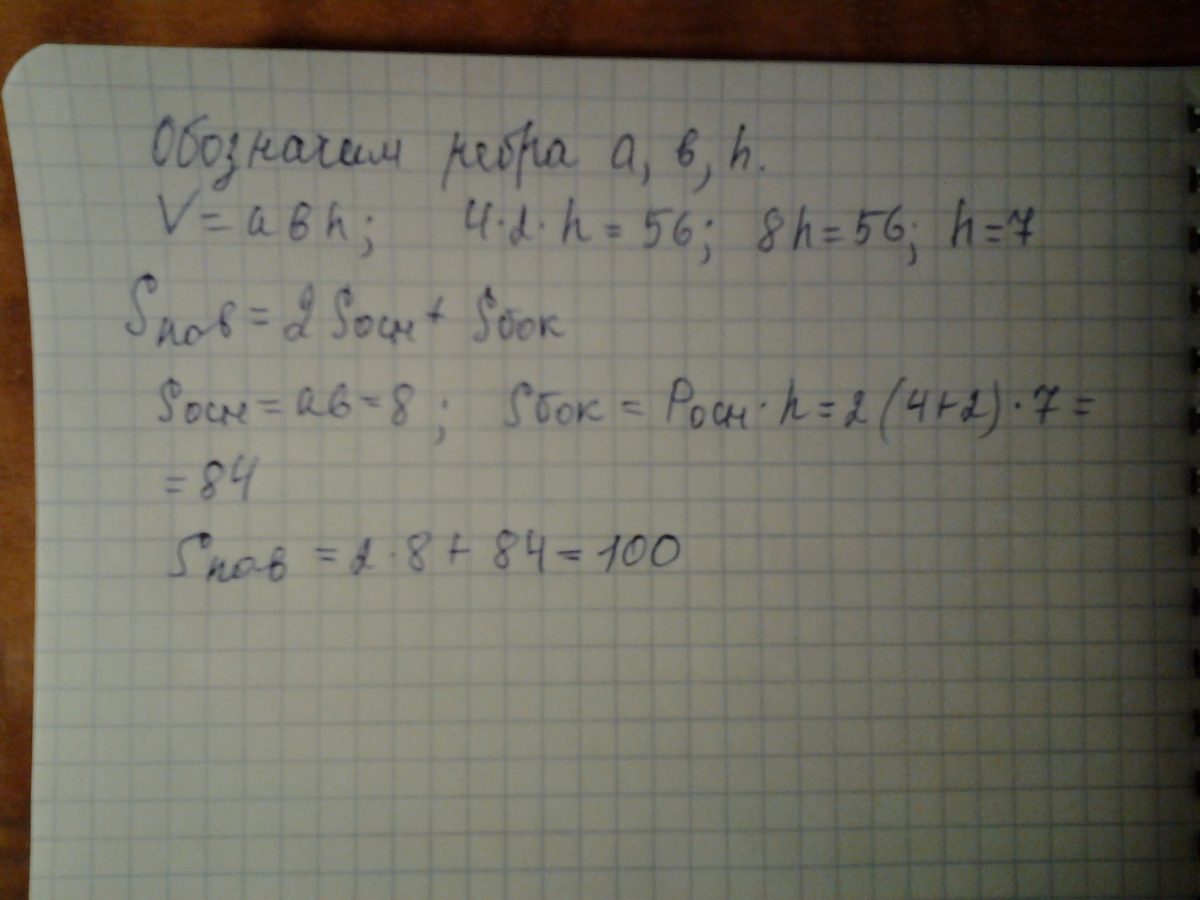 Всем привет ) ребят ,срочно помогите пожалуйста решить задачу по геометрии ( два ребра прямоугольного параллелепипеда выходящего из одной вершины равна 4 и2 , а объем 56. Найдите площадь поверхности )