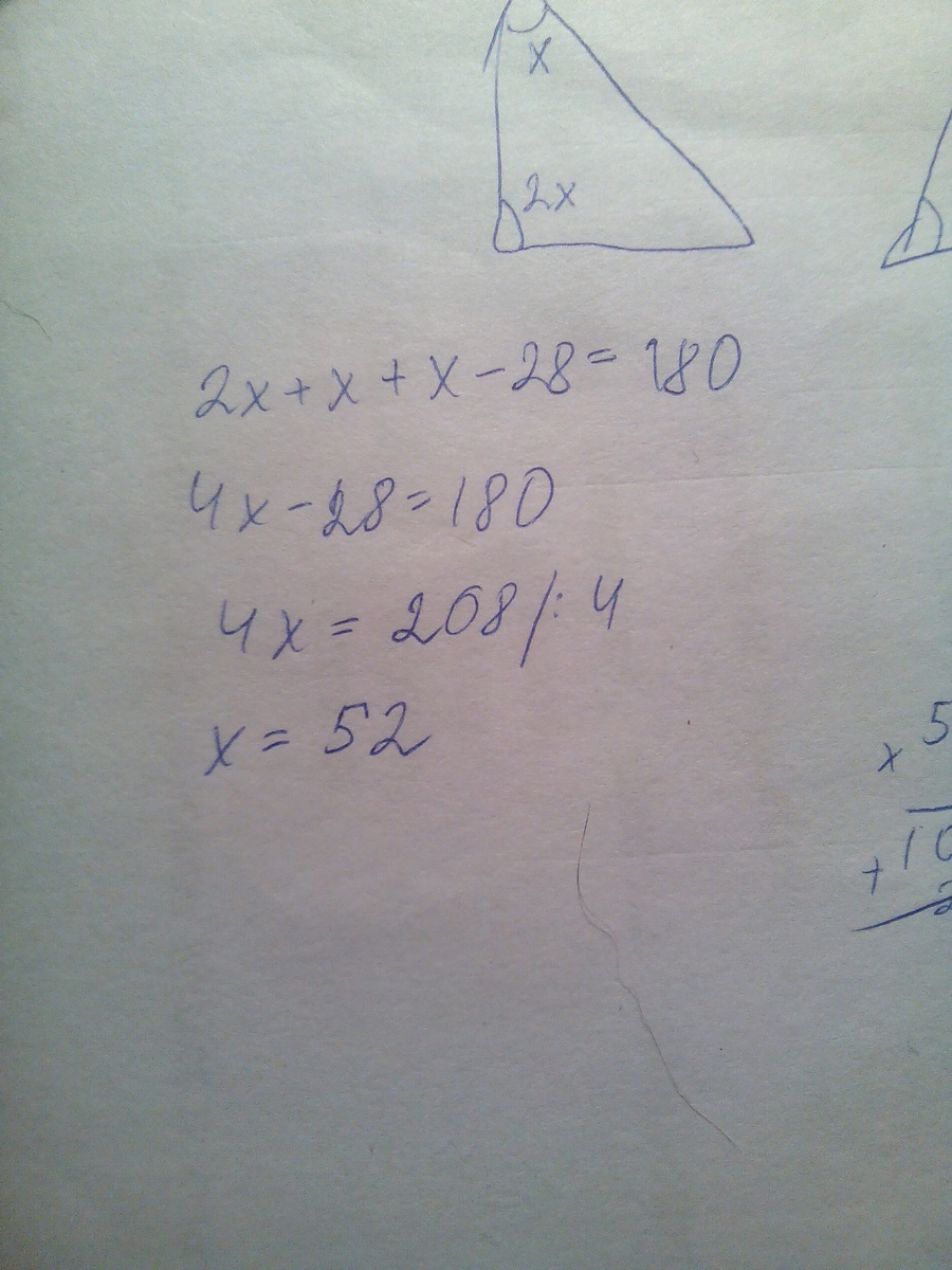 один угол треугольника в 2 раза меньше другого и на 28 градусов меньше третьего найти все углы в