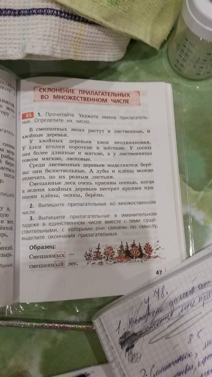 Смешанных (мн.ч) деревьях,лиственные(мн.ч),хвойные (мн.ч), у хвойных (мн.ч) деревьев,хвоя неодинаковая (ед.ч), иголки короткие(мн.ч) и жесткие (мн.ч), у сосны более длинные (мн.ч) и мягкие (мн.ч),у литсвенницы совсем мягкие(мн.ч), ласковые (мн.ч)