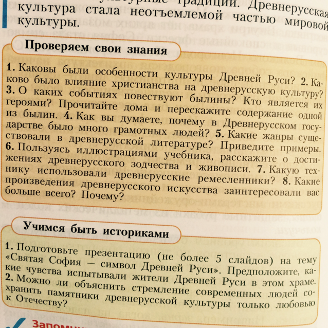 1)История Древней Руси охватывает период с X по XVII в. Несмотря на то что за это время произошли большие изменения в образе жизни и мировоззрении народа, культура данного периода имеет общие типические черты. Она качественно отличается от языческой культуры дохристианской Руси. Древнерусская культура формировалась на основе древнеславянского языка как средства культурного общения и сочетания двух идеологий - христианства и древней языческой традиции. Культура Руси складывается в те же века, что и становление русской государственности. Рождение народа шло одновременно по нескольким линиям - хозяйственной, политической, культурной. Русь складывалась и развивалась как средоточие огромного для того времени народа, жизнь которого развертывалась на огромной территории. На развитие русской культуры влияло также то, что Русь складывалась как равнинное государство, открытое всем как внутриплеменным отечественным, так и иноплеменным международным влияниям. В общей культуре Руси отразились как традиции полян, северян, радимичей, новгородских славян, других восточнославянских племен, так и влияние соседних народов, с которыми Русь обменивалась производственными навыками, торговала, воевала, мирилась.2)