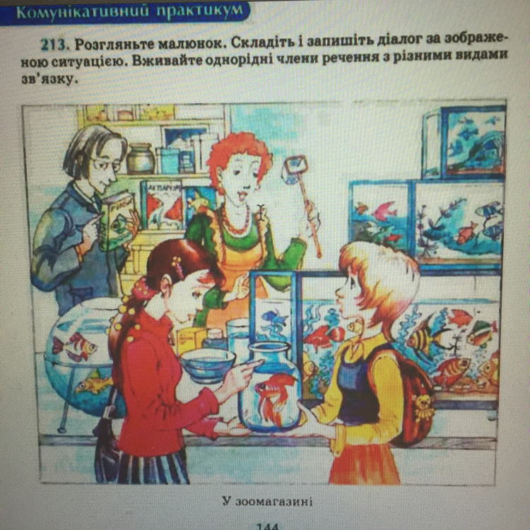 -Привіт,Марія -Привіт, Маринко -Давай сьогодні сходим у зоомагазин мене мама послала купити рибку будь-яку допоможеш мені вибрати? -Звісно допоможу ходімо -О дивись яка гарна рибка я ось цю хочу - Мені ця теж подобається.А скільки в тебе грошей бо вона дуже дорого стоє ? - у меня 20 гривень а скільки вона стоє -Вона стоє 52 гривні - Ну гаразд я піду по маму і прийду з мамой та куплю цю гарну рибку -Бувай Маринко - Бувай Марія