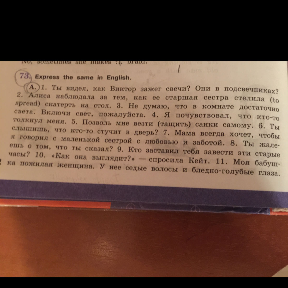 1) You saw Victor lit a candle? Are they in the candlesticks? 2) Alice watched how her older sister was laying the cloth on the table. 3) I do not think that the room was quite light. Turn on the light please. 4) I felt something that someone pushed me. 5) Let me take the sled yourself. 6) Do you hear that someone is knocking on the door? 7) My mother always wants me to talk to the little sister with love and care. 8) You're sorry about what you said? Who forced you to have these old watches? 10) "What's she like?" Kate asked. 11) My grandmother elderly woman. She has gray hair and pale blue eyes.