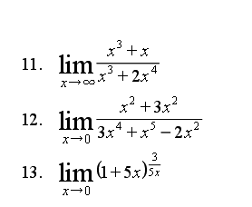 11) В этом пределе неизвестной стремится к бесконечности, если мы подставим в числитель и знаменатель бесконечность получится неопределенность бесконечность/бесконечность(бесконечность делить на бесконечность) В этом случае нужно и числитель и знаменатель разделить на большую степень которой является x^4 тогда предел будет равен: 0/2, общий ответ:0